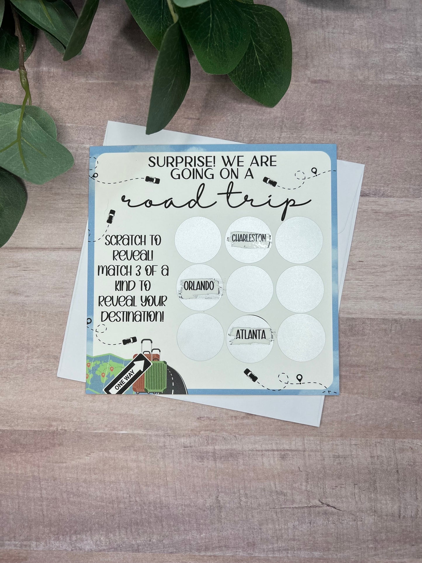 TheCraftyPharm's Road Trip Scratch and Match Vacation Reveal is fun and exciting! Use this unique card to reveal your next travel gift to your friends, family, or loved ones. This card gift is perfect for reveals for anniversaries, graduations, birthday, and surprises. Watch the anticipation build as your receiver uses this scratch off ticket to reveal the destination by revealing 3 of a kind. Your next announcement could be unforgettable!